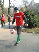 Desi foarte insistent, am continuat sa ne vedem de treaba, ca doar spatiul public este... public doh, iar jonglatul cu mingea in parc nu cred ca este interzis prin lege. A incercat sa ne sensibilizeze prin a ne spune ca baiatul lui este bolnav iar noi ii luam efectiv painea de la gura. Politicos, l am rugat sa inteleaga ca nu cerem bani de la trecatori si ca doar ne jucam cu o minge de fotbal, stationarea cetatenilor pentru "benoclare" fiind pur si simplu aleatoare si total independenta de noi. Dupa mai mult de o ora in care nu i a tacut gura o clipa, si a chemat niste "ajutoare", in alti cativa bosorogi. Nu numai atat, ne a amenintat ca si a contactat fiul sa ii sara in ajutor, fara sa uite sa precizeze ca fiul sau este boxeur. Cam ciudat pentru ca din cate spusese mai devreme baiatul sau era grav bolnav. Destul de iritati, am decis sa plecam, evident fara sa uitam sa ii uram o zi buna si multi multi bani neimpozitabili. Cam asta este o mica mostra din ****tul in care traim. Iata si 2 scurte filmulete de astazi