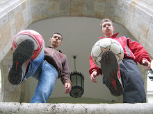 oameni respectabili in sesiuni si plini de examene, am zis sa mai schimbam putin atmosfera monotona si sa mergem sa mai facem ceva demonstratii de freestyle. si unde sa mergem noi decat la baietii de la antena hehe la gsptv. de multumit ce i drept lui alexandru, ca ne a deschis drumu ca sa zic asa, aparand si el la aceeasi emisiune. mare smecherie nu a fost asa... am batut ceva mingea, am mai raspuns la cateva intrebari si cam asta a fost. si uite asa de 3 saptamani in fiece joi seara am mers la nenea catalin de la smiley tivi, si am batut si eu si dinu si luci mingea hehe, am sa bag si neste linkuri aici. si cum oamenii se pare ca sunt receptivi in materie de batut mingea.. e posibil sa mai vina si cu alte propuneri si tot soiul de astfel de "propovaduiri" ale sportului. pana atunci insa, examenele vin si tot vin, asa ca v am lasat ca tre sa invat la finisaje. un click pe linkurile de mai jos ca sa ne vedeti batand mingea la tv